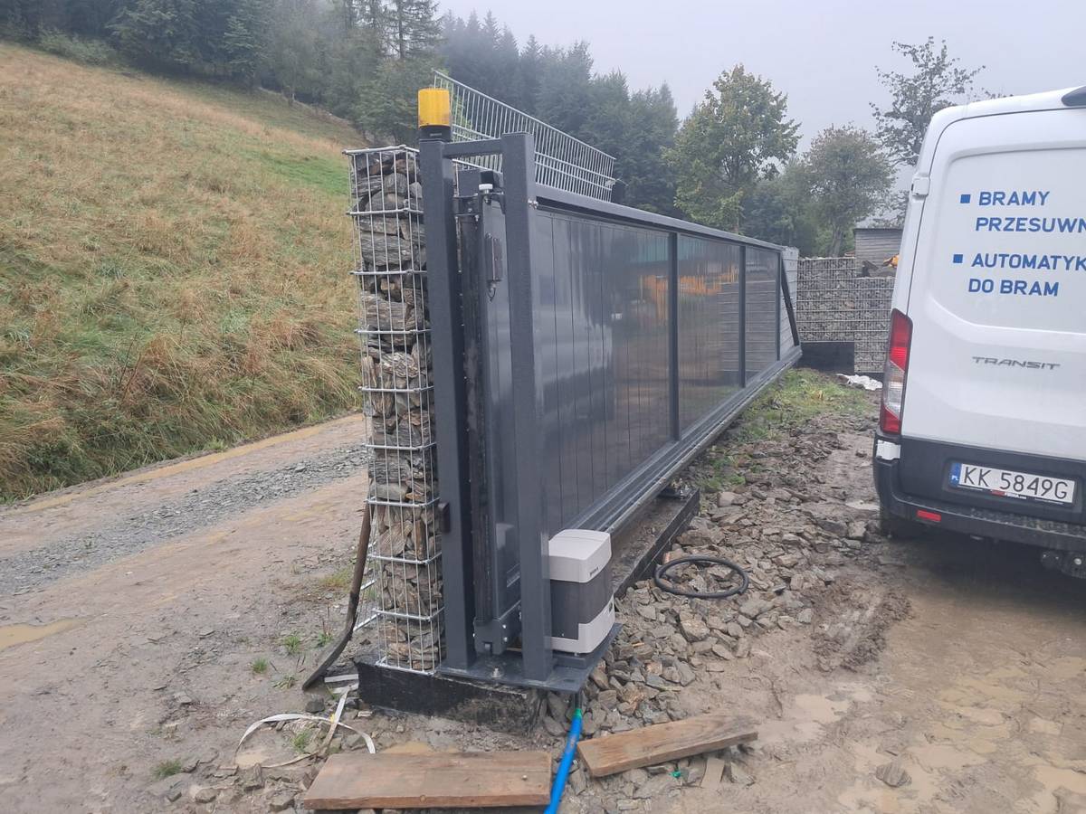 Featuring a full, elegant infill, the deep grey design provides maximum privacy while providing an aesthetically pleasing and robust closure to the property. The elegant appearance of the gate blends perfectly with the gabion fence. At the heart of this development is an advanced gate automation brands Beninca. This reliable drive guarantees smooth and quiet operation sliding gateThis ensures comfort and safety for years to come. The installation, carried out using professional equipment - including an excavator - went smoothly, taking into account the specifics of the ground, the terrain and the weight of the gate leaf. Choosing our sliding gate is an investment in the highest quality, which combines uncompromising reliability with convenience, perfectly meeting the needs of demanding customers from Zawoja and the surrounding area. We provide comprehensive services, from design through gate productionthrough to its professional installation.